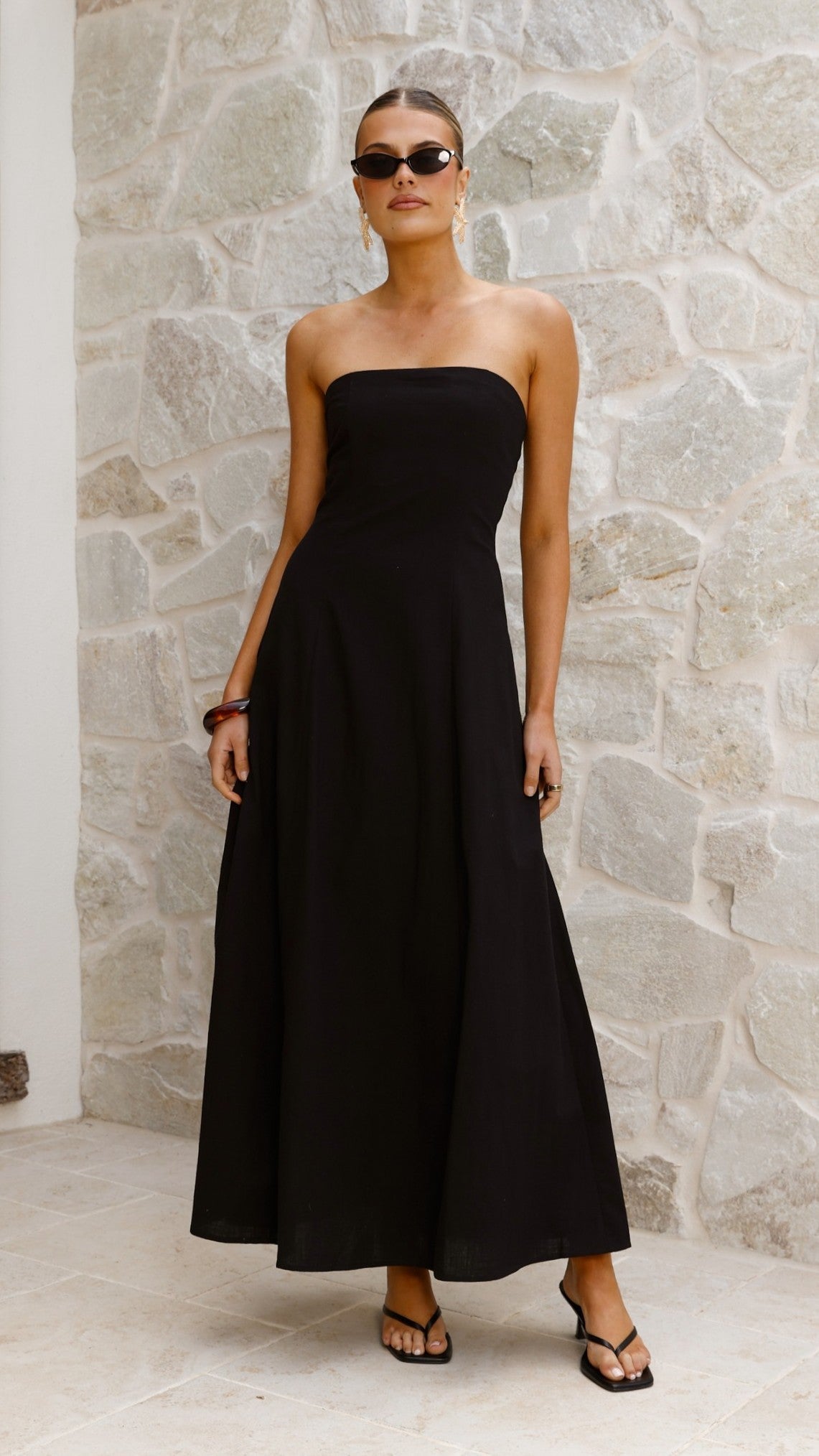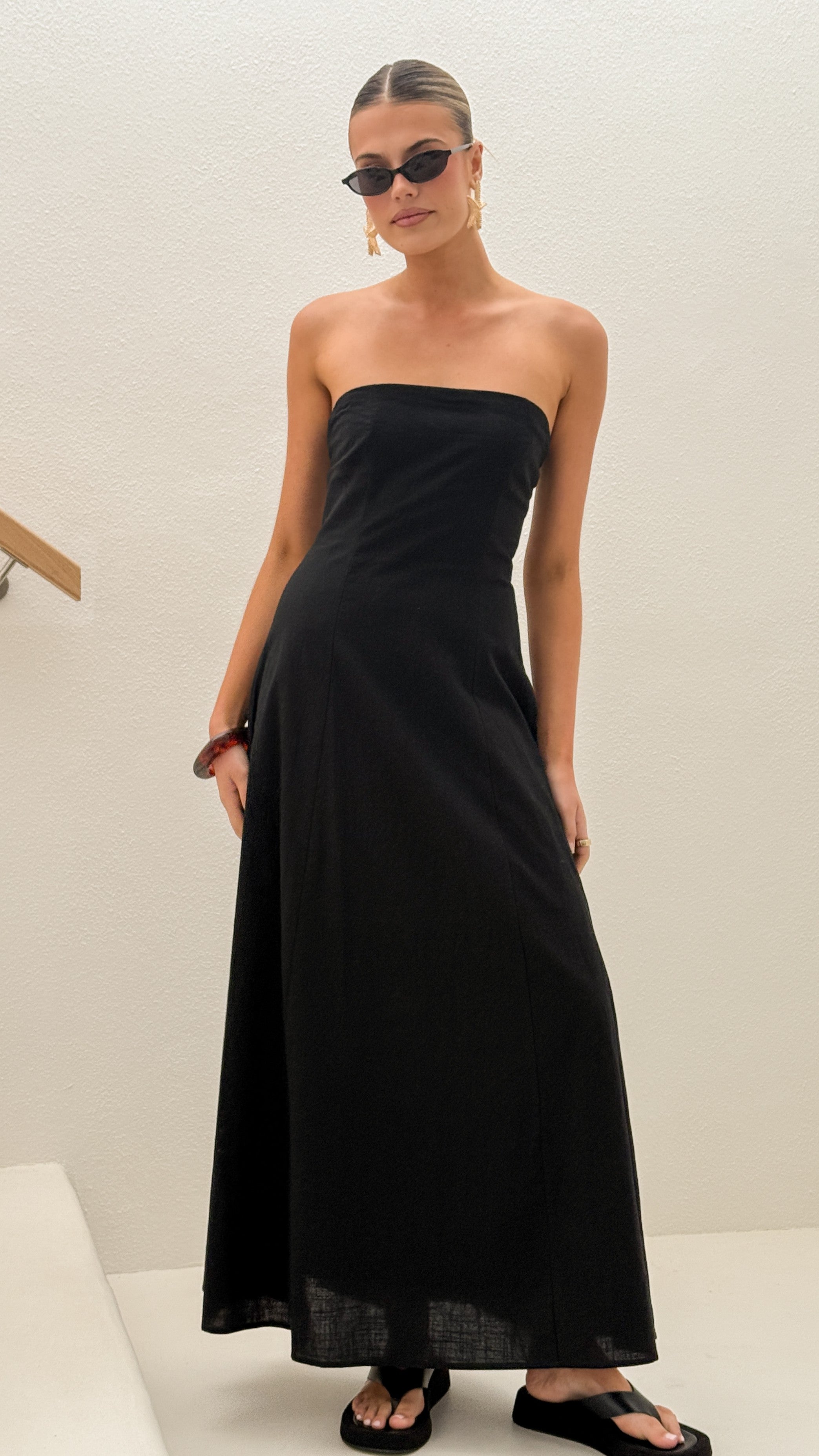 Elevate your elegance with the Astrid Strapless Maxi Dress in classic black. Featuring a sophisticated strapless design and linen-look fabric, this dress offers both comfort and style. The invisible center back zipper ensures a seamless fit, while thoughtful paneling enhances the silhouette. Fully lined for a polished finish, the Astrid dress is perfect for occasions where refined simplicity meets timeless grace.