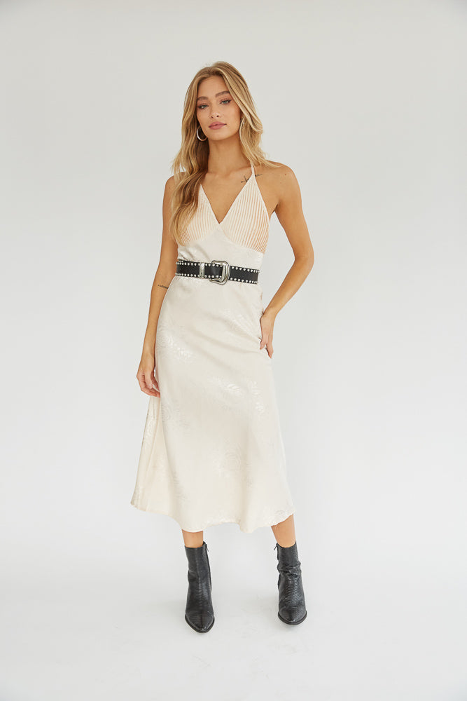 So much drama in the Dahlia Halter Midi Dress! This gorgeous piece features a halter v neckline, a pleated bust, and a subtle monochrome floral design. Available in black and nude. Pair with the for the perfect night out look!