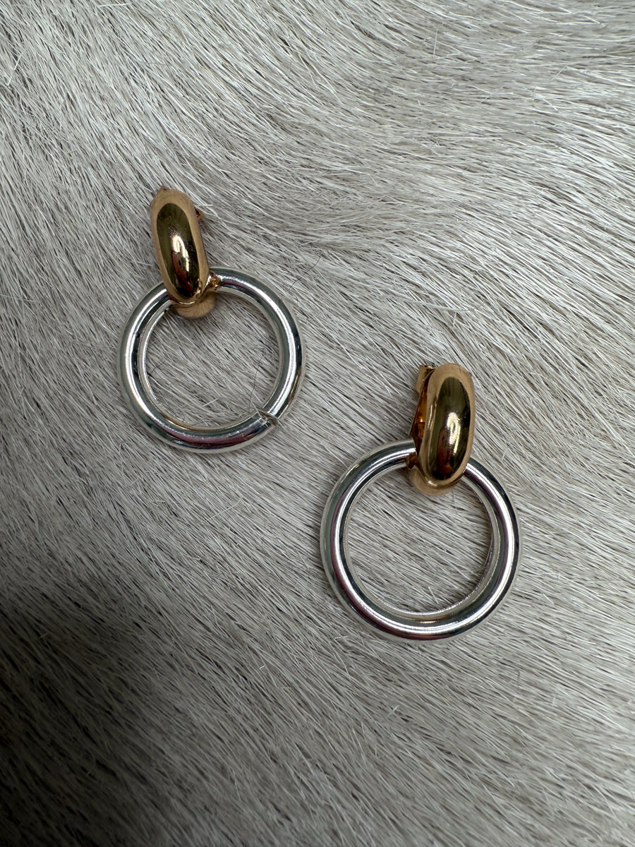 These Dannaka Interlock Hoop Earrings add a touch of sophistication to any outfit. The unique design of interlocking hoops creates a modern and elegant look, perfect for both casual and formal occasions. Crafted with mixed metal, these earrings offer versatility and an eye-catching mix of silver and gold. Elevate your style with these must-have earrings.