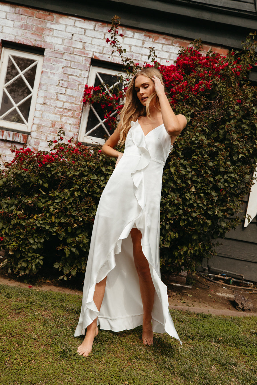 So elegant in the Esmerelda Ruffle Trim Maxi Dress! This maxi dress features an asymmetrical, cascading ruffle down the center, a high leg slit, a V-neckline, and an open back with an adjustable tie. Step into the to complete this formal look!