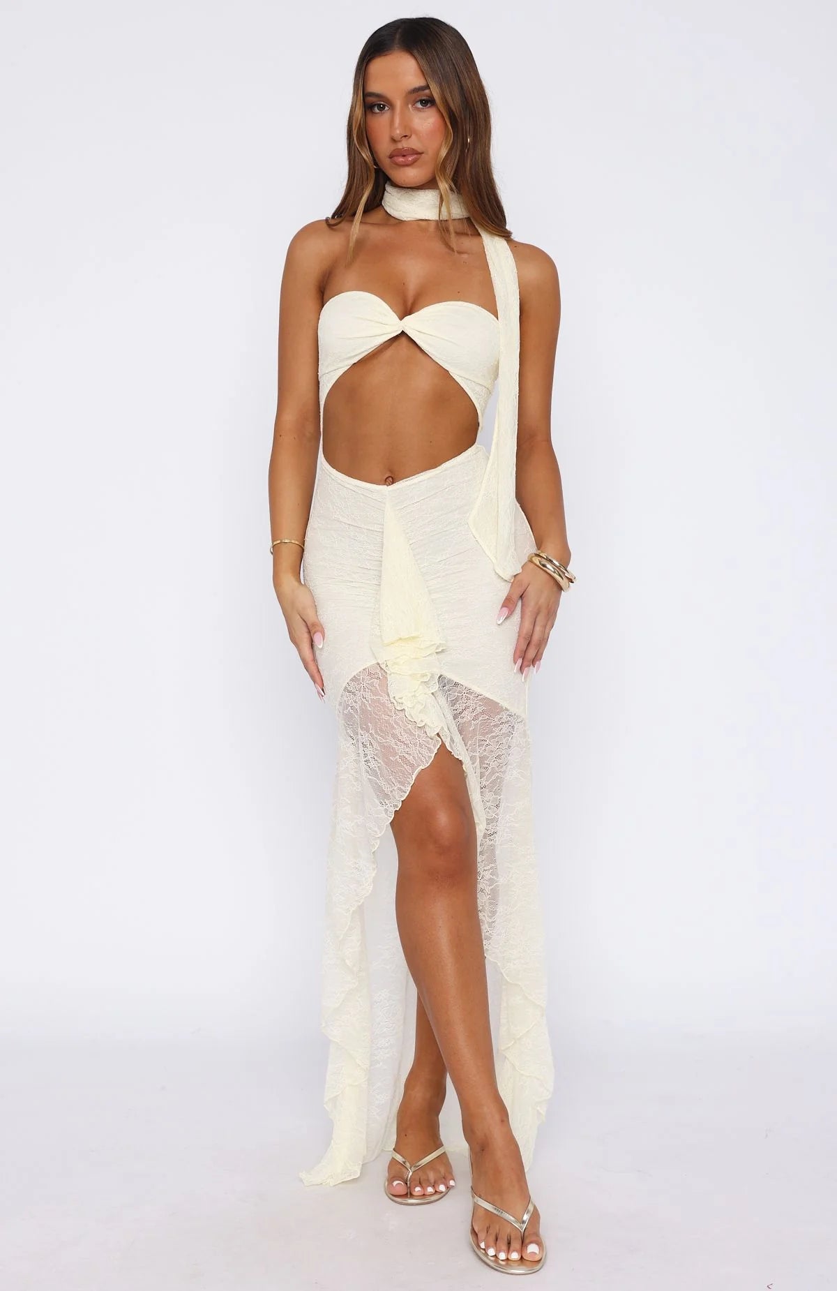 Breezy by day, boujee by night. The Inner Goddess Lace Maxi Dress Lemon features a detachable neck tie, strapless design with gel grip at bust, centre front cut out, lined bodice, sheer lace skirt design with centre front frill detailing and stretch material. Complete the look with the Josie Sandals and layered jewellery for a look we love.