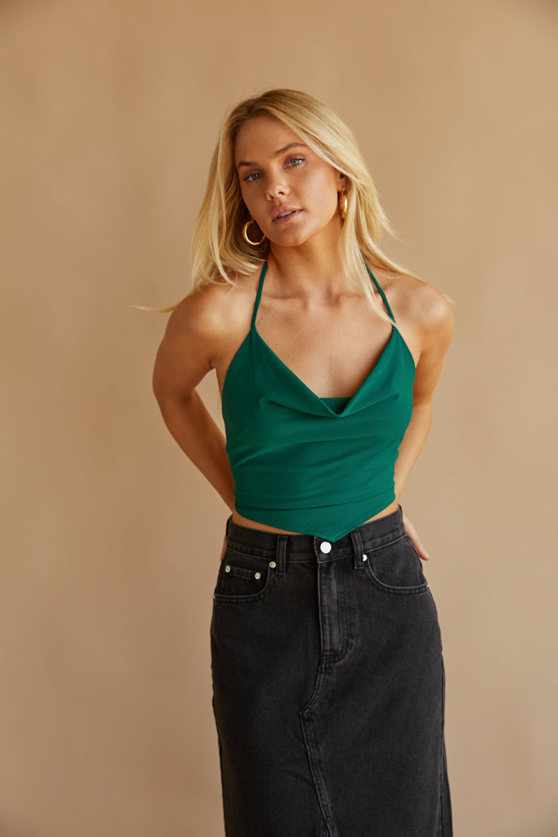 Everyone will be asking where you got the Jenna Cowl Neck Halter Top! This sexy top features a cowl halter neckline, open back with an adjustable tie, and a pointed hem. Available in green and marsala.