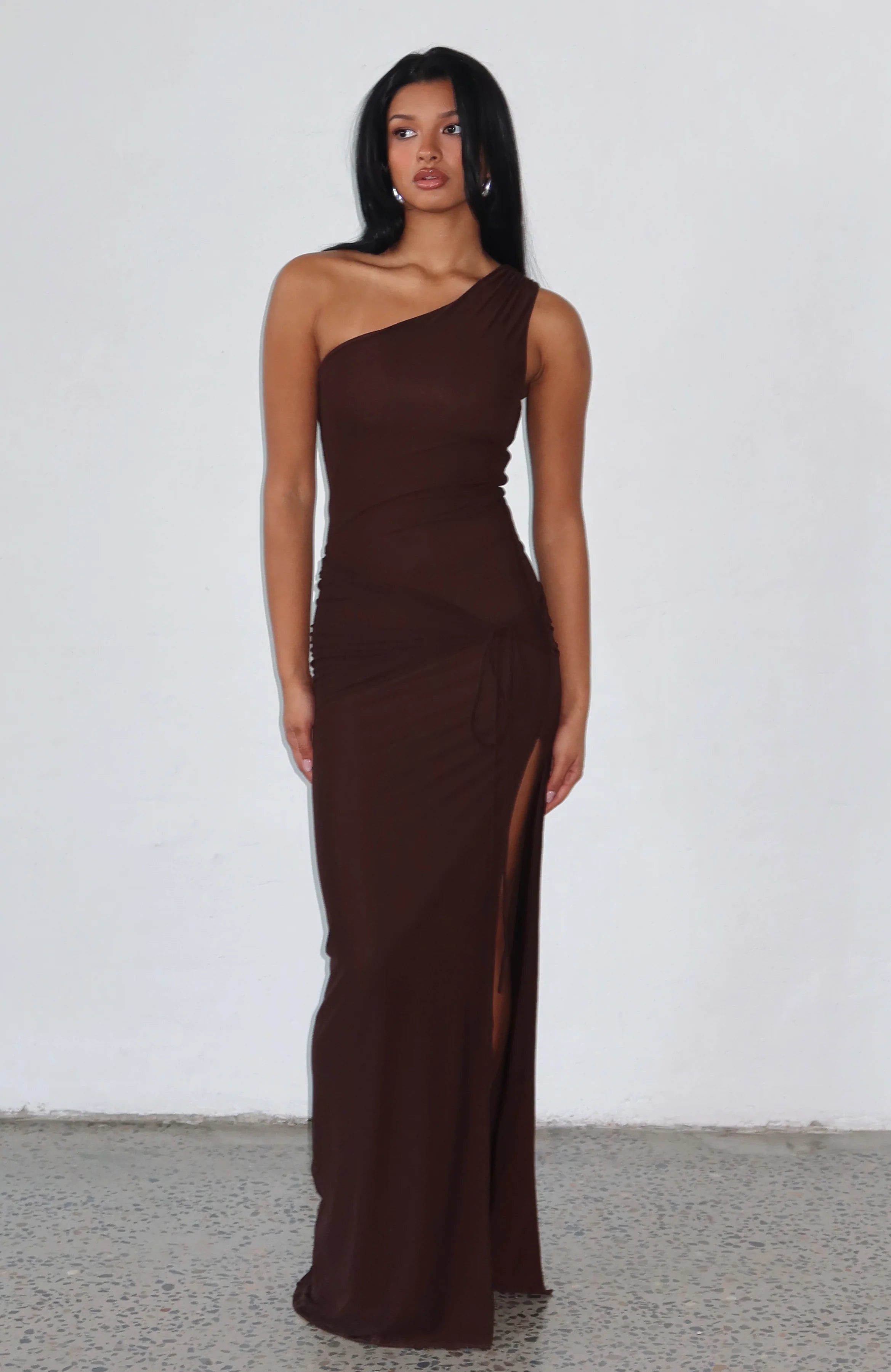 Birthday girl vibes! This dress features a sleek one-shoulder neckline, a fitted silhouette, and elegant draping across the waist. With a front leg split, full lining, and high-stretch fabric, it’s designed for comfort and style. Pair with simple heels and layered gold jewellery to complete your celebration-ready look.