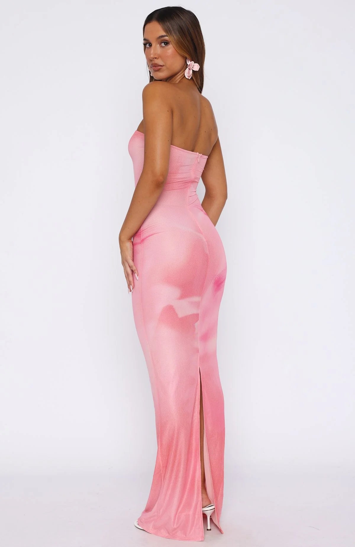 Set the standard in the On A Trip Maxi Dress Blossom Petal. Features a strapless design with gel grip on bust, back invisible zipper and clasp closure, mesh lined, semi-sheer, maxi length and back split detailing. Let the dress do all the talking and pair with perspex heels and gold accessories!