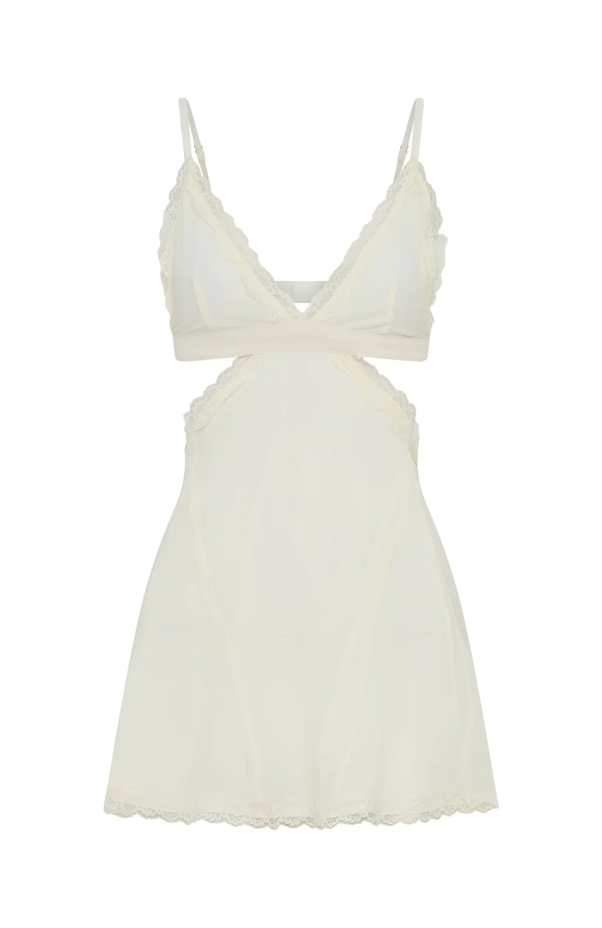 Take the stress out of weekend styling in the Polar Opposite Mini Dress Off Whitey. Features thin adjustable straps, low cut neckline, side cut-out design with open back design, lace trim detailing, lined, hidden side zipper with hook & eye and lightweight feel.